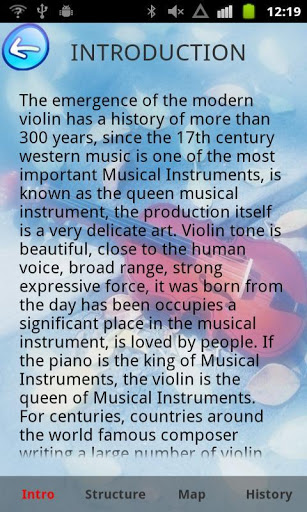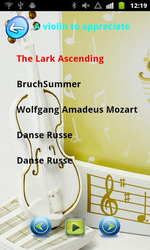 Simulated virtual violin but with the most realistic violin sound effect.Best and most comprehensive violin in the market!You can play the violin on your phone and enjoy some classic violin masterpiece in your spare time!This violin app is really powerful.You can not only play the violin ,but also get some knowledge about the violin.The most wonderful part it that you can get some free simple tutorial.When you open this application,you will see a cleat user interface.It is divided into four parts:PLAY THE SONG,INTRODUCTION OF THE VIOLIN,SIMPLE TUTORIAL ,A VIOLIN TO APPRECIATE.PLAY THE SONG:It is very easy to play it.Click the play the song area,you will see a virtual violin.touch any part of the screen,the fiddle stick will appear.Pull it like you are playing the real violin.At this time,you can heat the beautiful violin sound.INTRODUCTION OF THE VIOLIN:In this part,you can learn more about the violin.You will get the introduction about the violin,its structure,violinmap and its history.SIMPLE TUTORIAL:In this part,you will have 5 lessons .You can study it by yourself.You will know the violin,knowledge staff.Understand the notes.Get the posture of playing the violin.Know more about the tuning.After learning all of these,you have become a teacher.A VIOLIN TO APPRECIATE:5 classic violin music is stored in this part with a built-in player.You can do such operations as play,pause,last one and next one.Relax yourself.Appreciate the violin music with your eyes closed.This app is both funny and professional.Don't hesitate to download it to your smartphone!Appreciate your 5 stars and comments.****************************Declaration************************This is the free version, so you will understand that we need to use ads so we can develop more useful and funny things. This app may use your notification or icon ads, but you will easily opt-out or just ignore them. If you don't agree with these ads, please don't install it, thank you.***************************************************************A person who makes or repairs violin is called a luthier. The parts of a violin are usually made from different types of wood ( electric violins may not be made of wood at all, since their sound may not be dependent on specific acoustic characteristics of the instrument #39;s construction), and it is usually strung with gut, nylon or other synthetic, or steel strings.