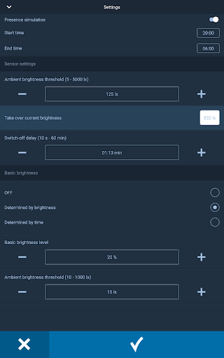 - Activation of a presence simulation at a house (if you are not at home), the same way to set a basic brightness and nightlight (start time and end time, illumination level)