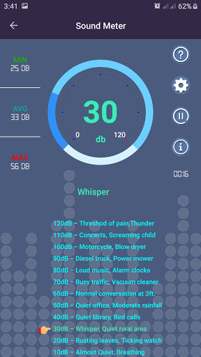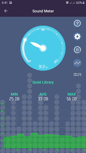 - SPL Meter (tahap tekanan bunyi) menggunakan mikrofon telefon untuk mengukur bunyi yang terlalu berisik. Mikrofon dalam kebanyakan peranti Android adalah sejajar dengan suara manusia. Bunyi yang sangat kuat (lebih dari 90 dB) mungkin tidak diiktiraf dalam kebanyakan peranti. Oleh itu, sila gunakannya sebagai alat tambahan. Kadang-kadang nilai DB yang dikira oleh meter tahap tekanan tidak tepat sebagai meter tahap tekanan sebenar, dan ini disebabkan oleh beberapa mikrofon peranti telefon pintar sejajar dengan suara manusia.
