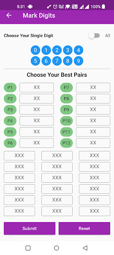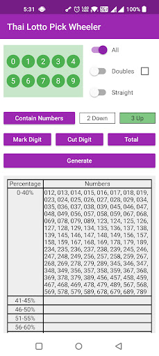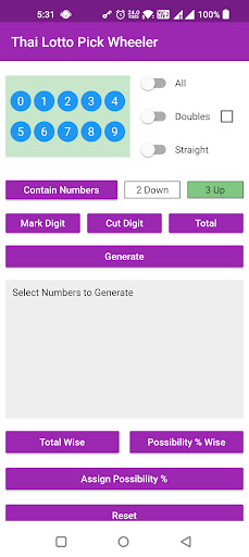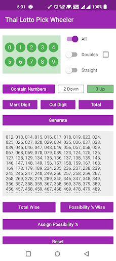 Thai Lotto Pick Wheeler adalah aplikasi yang komprehensif dan mesra pengguna yang membantu pengguna menjana dan memilih kombinasi yang menang untuk loteri Thai.Ia menawarkan pelbagai ciri yang direka untuk memudahkan pengguna memilih nombor mereka dan meningkatkan peluang mereka untuk menang.(3UP) dan nombor 2 digit (2Down) berdasarkan input yang ditentukan oleh pengguna.Pengguna boleh memasukkan nombor mereka sendiri, dan aplikasinya akan menghasilkan senarai kombinasi yang termasuk nombor tersebut.Ini boleh menjadi alat yang berguna untuk pemain yang mempunyai nombor tertentu yang mereka rasa bernasib baik atau mempunyai kebarangkalian yang lebih tinggi untuk ditarik.Pengguna untuk mengecilkan pilihan mereka dengan digit, pasangan, dan jumlah tunggal.Ini dapat membantu pengguna memilih kombinasi yang lebih cenderung ditarik berdasarkan analisis statistik.Ini boleh membantu untuk menjejaki nombor mana yang telah dipilih dan mengelakkan pendua.Aplikasi ini juga memaparkan nombor dalam format keseluruhan, menjadikannya lebih mudah bagi pengguna untuk melihat pecahan pilihan mereka.Mengira peratusan keseluruhan yang mungkin bagi satu set nombor berdasarkan peratusan yang ditentukan oleh pengguna.Ini dapat membantu pengguna menentukan kemungkinan bilangan mereka yang ditarik dalam loteri dan membuat keputusan yang lebih tepat mengenai kombinasi yang hendak dipilih.Membantu pengguna meningkatkan peluang mereka untuk memenangi loteri Thai.Generasi gabungannya, penapisan nombor, penandaan pemilihan, dan ciri -ciri pengiraan kebarangkalian menjadikannya sumber yang berharga bagi sesiapa yang ingin meningkatkan peluang mereka untuk menang.