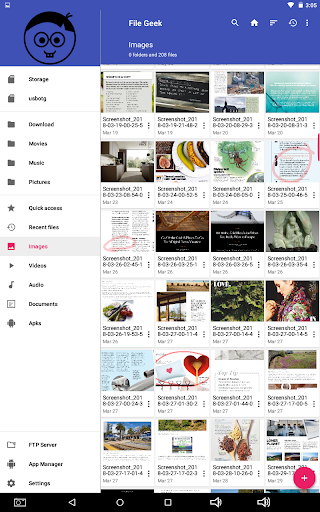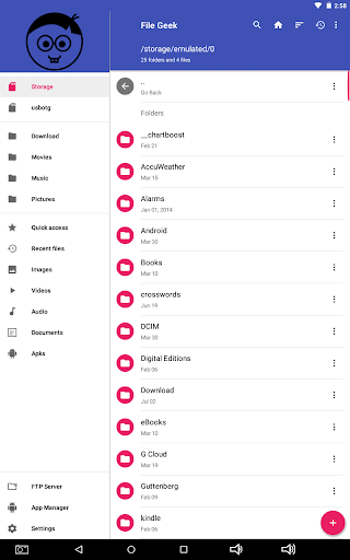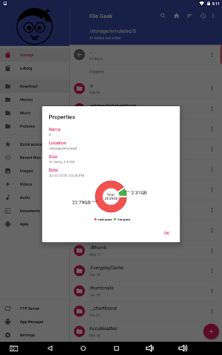 File Geek adalah pengurus fail lanjutan dan penjelajah yang membolehkan pengguna Android melayari dan mengubah suai semua fail pada peranti Android, termasuk yang tersembunyi dan tanpa semua iklan yang menjengkelkan atau pembelian dalam aplikasi yang kebanyakan pengurus fail lain. GEEK File membolehkan pengguna dengan mudah membuka, menamakan semula, memotong, menyalin, memindahkan, memadam, menyulitkan, berkongsi, atau melihat ciri-ciri fail serta membuat folder dan fail baru. GEEK File juga membolehkan pengguna untuk menyesuaikan warna aplikasi kepada pengguna yang suka dan menawarkan banyak pilihan lain yang disesuaikan dan alat terbina dalam. GEEK File memberikan akses cepat pengguna ke semua imej, video, audio, dokumen, fail terkini, dan APK pada peranti Android. GEEK fail mempunyai ciri carian yang dibina yang membolehkan pengguna mencari peranti dengan cepat untuk mencari dan mengakses fail. GEEK File menunjukkan kali terakhir fail diubahsuai dan saiz fail.