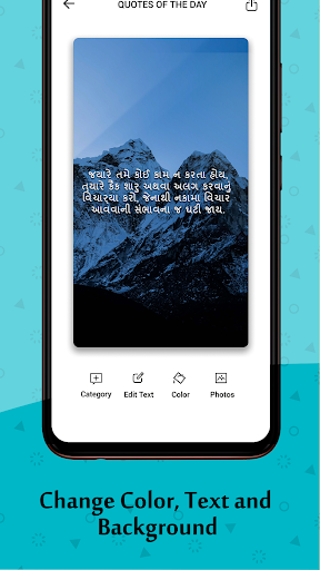 App's photo editing feature helps to improve looks of your quote and status image. Also, allow to take photo from your gallery and edit. Photo editing tool include font style, font color, custom background and share it in various social media.
