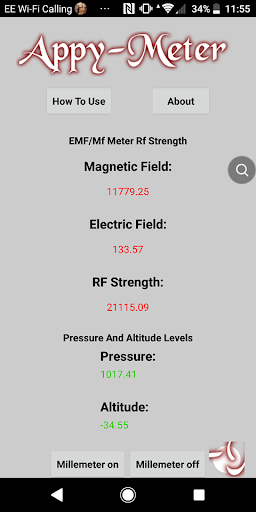 Appy-Meter is a all in one EMF/Mf/Pressure Meter Offering functions that normally only hardware offers, this can be used for construction/Building, But is intended to be used in the paranormal field. what does this app offer? Magnetic Field live readings, Electric Field Live readings, Rf Strenght Live readings, Rf Strength is the one to watching, The app also offers
