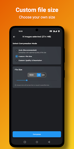 Aplikasi ini menawarkan pilihan saiz fail tersuai, yang boleh digunakan jika anda ingin menyasarkan sesuatuSaiz fail seperti 10kb atau 50kb.Cukup masukkan saiz fail yang anda inginkan dan aplikasi akan memampatkan imej di, atau di bawah, saiz fail yang diberikan.Anda boleh menyasarkan saiz fail yang berbeza seperti 500kb, 200kb, 100kb, 50kb, 20kb, 10kb, atau saiz tersuai lain pilihan anda.Ciri ini berguna apabila anda ingin mengubah saiz atau memampatkan imej kad pan anda, memampatkan imej untuk status WhatsApp anda, mengubah saiz pasport anda, dan lain -lain