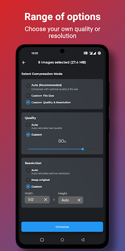 Secara lalai, & quot; auto & quot;Pilihan dipilih untuk pemampatan, yang mempunyai konfigurasi mampatan yang paling optimum, jadi anda tidak perlu bimbang tentang tetapan.Hanya pilih & quot; auto & quot;pilihan, duduk, dan berehat sementara aplikasi memampatkan foto anda.App menyokong semua format imej utama termasuk JPG, JPEG, PNG, dan banyak lagi.Aplikasi ini mempunyai pilihan auto-kompres yang secara automatik memutuskan resolusi terbaik dan kualiti output berdasarkan imej input.Ini menjimatkan kerumitan penyesuaian manual dan memastikan hasil yang optimum setiap kali.