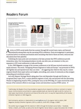 Compelling content informs and empowers a multidisciplinary technical audience. SWE Magazine offers a broader, humanistic perspective that situates the engineering profession and the contributions and status of women engineers in a larger context that is both historical and contemporary, providing a springboard for individual growth and impacting the profession.