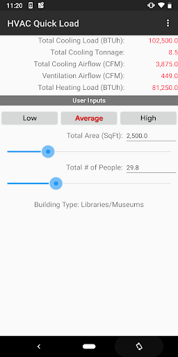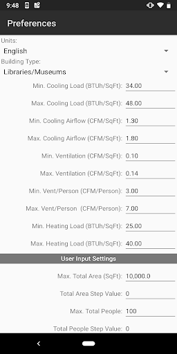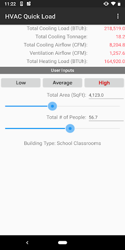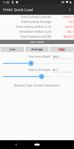 Load HVAC Pantas untuk Android adalah satu-satunya dan hanya peraturan pemanasan HVAC dan penyejukan HVAB dan aplikasi penyejukan untuk peranti mudah alih Google Android. Aplikasi ini melaksanakan pengiraan penyejukan HVAC dan pemanasan HVAB dan pemanasan untuk pelbagai jenis bangunan komersial, perindustrian, institusi, dan kediaman. Ia membolehkan anda dengan cepat mengira jumlah penyejukan dan pemanasan yang diperlukan (dalam BTU / HR atau Tonnage) dan aliran udara (CFM atau L / S) dengan memasukkan hanya jenis bangunan, jumlah kawasan persegi dan bilangan orang.
