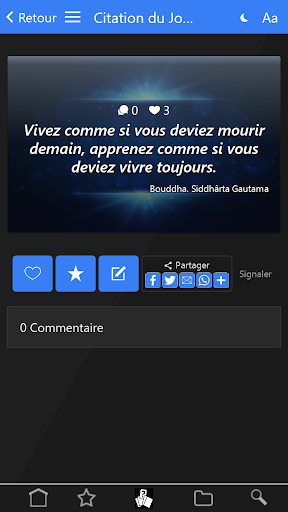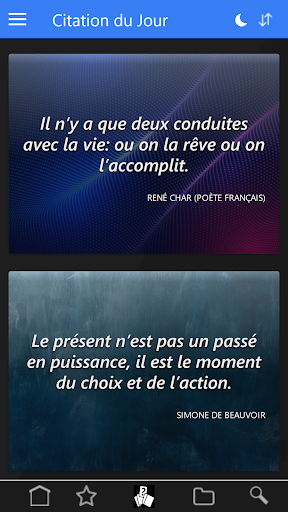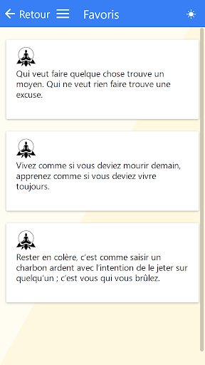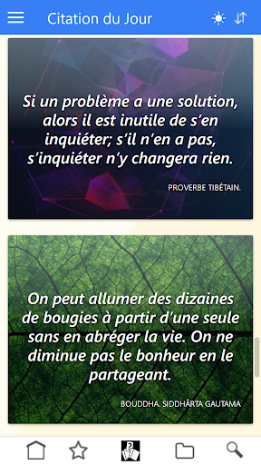 Une citation par jour de paroles sages et inspirantes à méditer, choisies parmi les belles phrases de grands penseurs, vous sera délivrée chaque jour. Chacune sera ensuite archivée dans la base et classée par catégorie. Vous aurez également la possibilité d'en choisir une en mode aléatoire en espérant que celle-ci vous éclaire et vous fasse avancer.