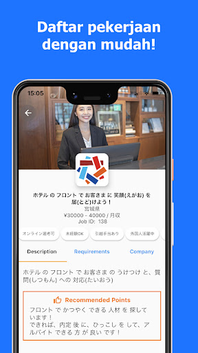 Sambungkan pekerja pekerjaan yang dibangunkan oleh Fourth Valley Concierge Corporation di Jepun.Matlamat kami adalah untuk menjadi aplikasi carian pekerjaan yang terbaik dengan menyediakan kekosongan jawatan yang terbaik untuk calon pekerja dan syarikat Jepun dengan reputasi yang baik, untuk kebajikan para pekerjanya.