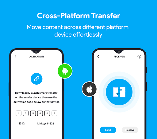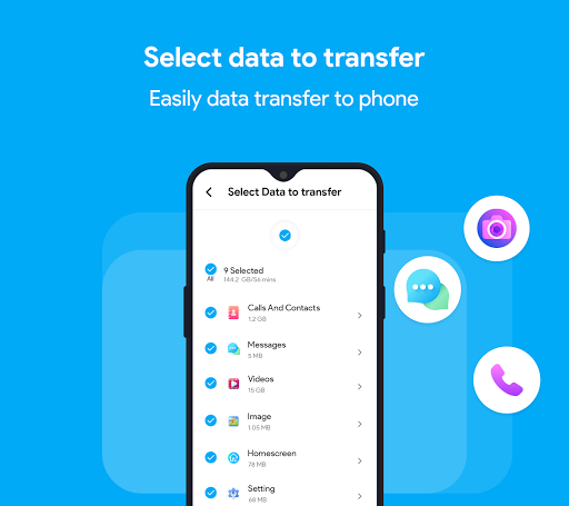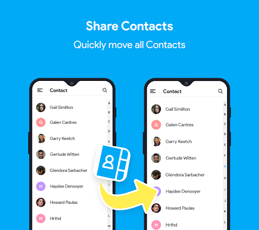 memberi anda kebebasan untuk memindahkan kenalan, muzik, foto, kalendar, mesej teks anda. Plus pemindahan data dari telefon ke telefon atau dari satu atau lebih peranti lama anda ke dalam satu peranti di pemindahan mudah alih. Ia menyokong rangkaian hotspot / wifi percuma pemindahan fail selamat & pemindahan fail yang besar dengan cekap.