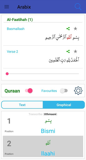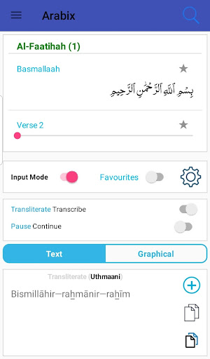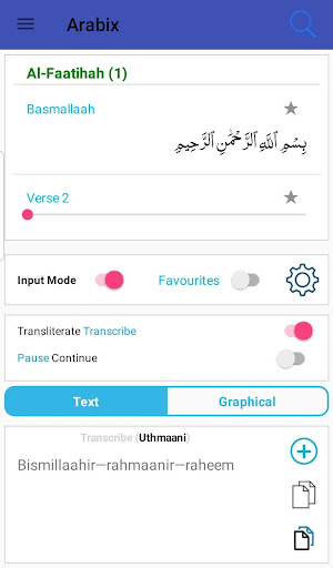 1. Tukar teks bahasa Arab ke dalam kedua-dua bahasa Inggeris yang disalin dan transkripsi 2. Pilih teks Qur'aanic, nama dan frasa bahasa Arab biasa dari senarai yang telah ditetapkan
