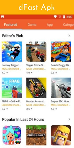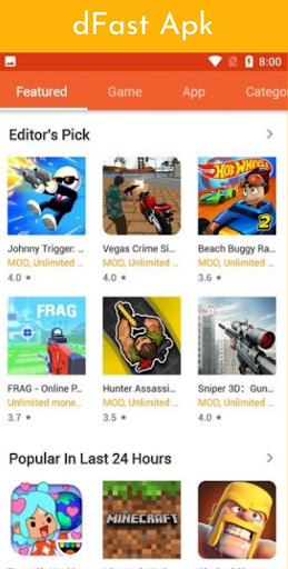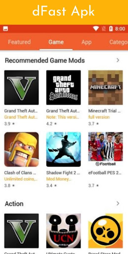 This new dFast app guide is a very visual app that guides the user's attention to help them to find the app he or she may be interested in. d fast download app guide main page shows you different tabs and menus to help you to quickly filter your search, looking for trending apps, games, collections...