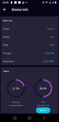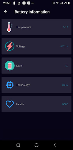 - Memaparkan maklumat mengenai telefon, memori yang digunakan dan bateri: voltan, suhu, kapasiti, status bateri, sejarah pengecas bateri.