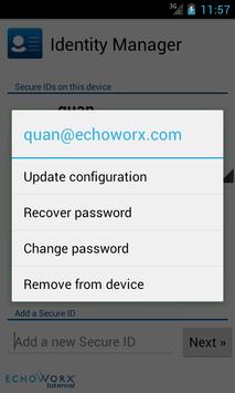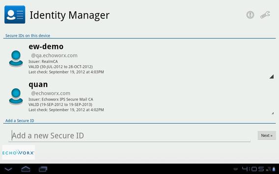 Identity Manager, from Echoworx, is a powerful credential management platform for the Android operating system. With Identity Manager, users can manage their credentials directly on their Android device(s). Credentials are retrieved dynamically from the cloud and stored encrypted on the device. Even if the device is lost or stolen, the credentials cannot be compromised and no unauthorized application can access them.