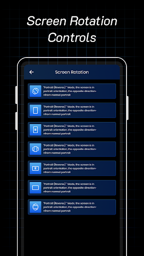 Dalam aplikasi ini mudah untuk mengawal potret orientasi skrin telefon anda, landskap, mendatar, menegak, potret terbalik, dan landskap terbalik.Cegah putaran auto skrin dan pilih orientasi skrin yang anda inginkan dengan sebarang aplikasi