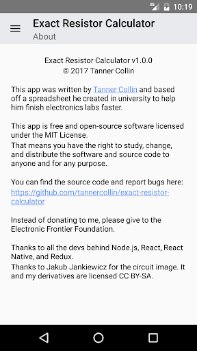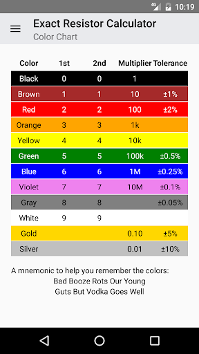 A resistor color chart is included for convince when you are searching through your pile of resistors. You will also find a help section, tips section, and complete working usage example included in the app.
