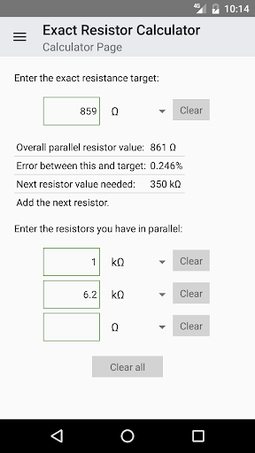 This app recommends resistors for you to combine in parallel to create a very precise resistance value. It works iteratively by calculating the best resistor value to add based on the measured values of resistors you’ve previously added. You can usually get within 1% of your target with 2 or 3 resistors.