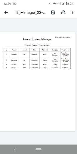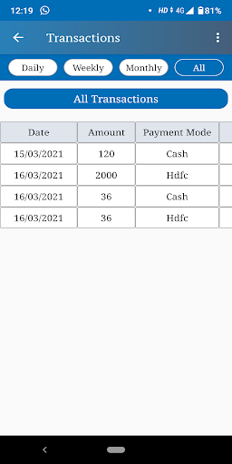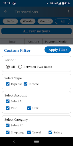 7. Transaksi - Dalam bahagian ini, anda dapat melihat semua urus niaga anda dalam bentuk jadual. Bersama-sama dengan anda boleh menapis urus niaga bulan bijak, minggu bijak dan setiap hari. Anda boleh memohon Penapis Custom juga. Selepas penapisan, anda boleh menjana PDF juga.