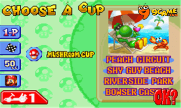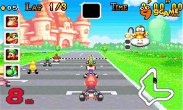 Super Circuit is a kart racing video game in which the player races in a kart against other teams in different courses. The game screen indicates the current standings in a race, the number of laps needed to finish and incoming weapons. Like in the previous installments, players can pick up item boxes to receive a randomly selected item and use it to impede the opposition and gain the advantage. Some items, such as shells and bananas, allow the player to hit others to slow them down, while other items, such as the star power-up, render them temporarily invincible to attacks. This is the second Mario Kart game to include coins, which increases the top speed of the karts.