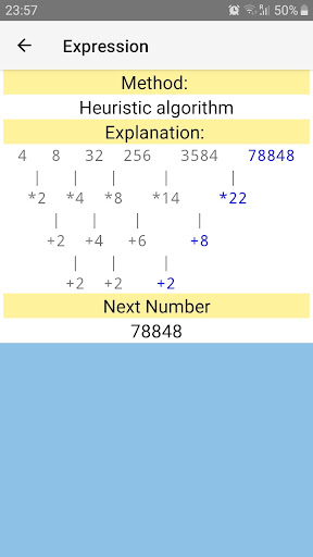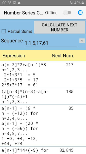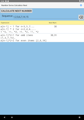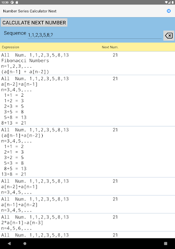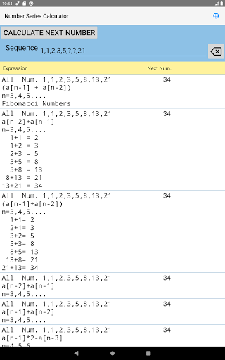 Aplikasi ini bukan sahaja mengira nombor dan huruf yang hilang dari urutan, tetapi juga mendapati formula dan dalam beberapa kes, nama urutan (Siri Fibonacci, perkembangan aritmetik, perkembangan geometri, nombor perdana dan lain -lain).Anda juga boleh melihat perwakilan grafik urutan atau fungsi anda sendiri.Siri nombor (siri Fibonacci, urutan aritmetik, urutan geometri dan lain-lain)
