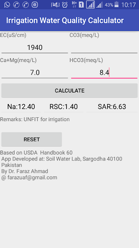 Calculates RSC, SAR, Na from measured EC, Ca mg, Carbonates and Bicarbonates.