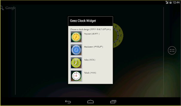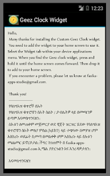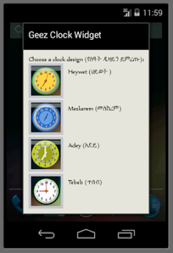 The widget is a clock with Geez (Ethiopic) numerals on the dial, and hour as well as minute hands. The widget has four optional designs and easily configurable. The widget requires no special permission. This is a simple analogue clock widget displaying current time (hour and minute).