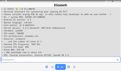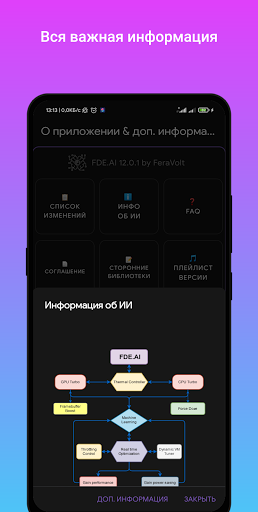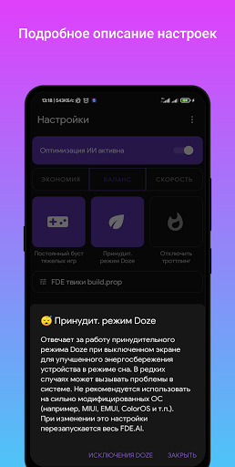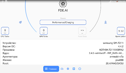 fde.ai - Pengoptimum Automatik Maksimum OS Android. Aspek yang paling berbeza dari tetapan OS dan kernel Linux ditangkap. Pada masa yang sama, FDE.ai adalah platform silang maksimum. Segala-galanya dilakukan dengan cara os dan kernel Linux. Program ini menetapkan pelbagai parameter berdasarkan konfigurasi teknikal peranti dan menggunakan tetapan yang optimum berdasarkan faktor seperti CPU (seni bina, kekerapan, bilangan kernel), RAM, ROM (jenis, saiz), versi OS, dll. Semua tetapan tidak digunakan secara sistematik (tidak menyentuh partition sistem). Sebahagian daripada fungsi program mungkin tidak disokong oleh pelbagai pemproses, nukleus.