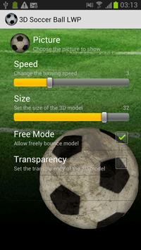 After selecting “3D Football LWP Ball”, you can configure the APP on “settings”. Also you can change the color, allow free bouncy, change turning speed, modify its transparency and adjust the size.