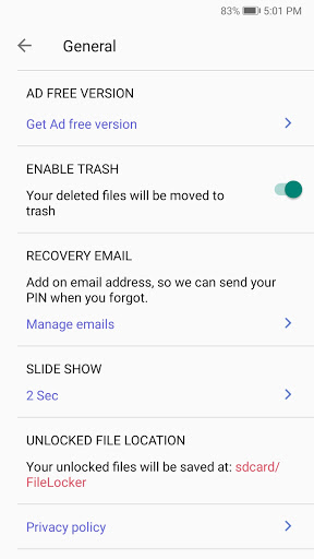 "File Locker Lock" encrypts your file and save in secret location in your SD Card so your file is completely secure. Hide any type of files with file locker. File Locker Lock ensures that family and friends who use your phone don’t see your private files, if they browse through your gallery, photo album or any file manager. This also works as Video locker, Image locker.