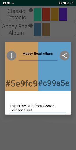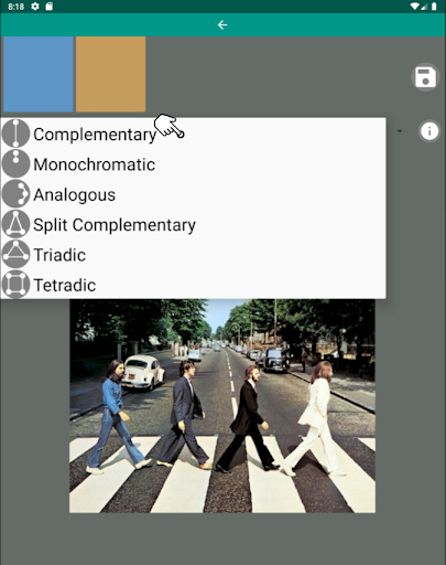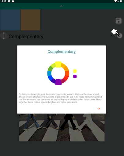 Dapatkan warna harmonik dari imej anda, berdasarkan teori warna.Terdapat enam taktik yang berbeza.Komplementari, monochromatic, analog, berpecah pelengkap, triadik dan tetradic.Bunyi banyak?Jangan bimbang anda tidak perlu ingat mana-mana daripada mereka.Itulah aplikasi ini di sini untuk!Belajar, memohon dan meneroka keharmonian warna.Aplikasi ini adalah untuk semua orang bagaimana mahu menjadikan hidupnya lebih berwarna-warni.Bagi orang yang bergaya, pereka atau sesiapa yang mencari untuk rempah-rempah, ini adalah peluang yang sempurna untuk melakukannya dengan tepat.Cuba, itu percuma!