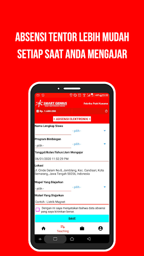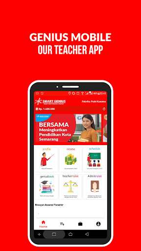 Genius Mobile didesain untuk menunjang proses kegiatan belajar mengajar guru-guru di Bimbel Smart Genius Indonesia baik untuk kelas maupun privat. Dengan menjadi guru di Bimbel Smart Genius Indonesia, Anda dapat mengajar murid-murid dengan mudah dan nyaman dengan dukungan Aplikasi ini di smartphone Anda.