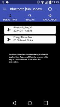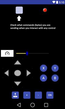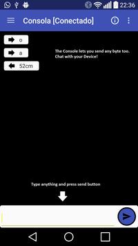 This app will let you make a bluetooth exploration to give you the chance to stablish a connection with devices close to you. Then, you will be able to send commands (bytes) to your connected device by simply interacting with the app controls available.