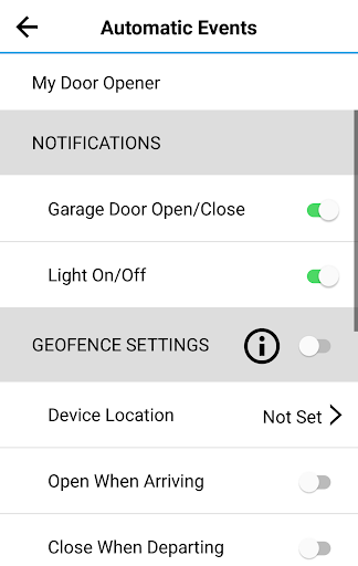 - Pembukaan dan penutupan pintu automatik berdasarkan jalan menuju / jauh dari pintu garaj melalui penentuan geofencing.