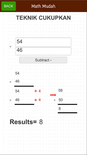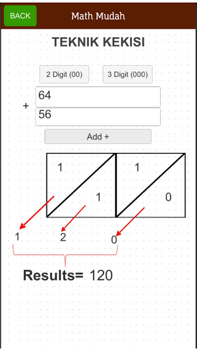 Math Mudah is an app that help users to know the basic techniques of addition, subtraction, multiplication and division. Math Mudah will help to show calculations and methods of mathematical questions that user created. Math Mudah also provide quizes for users to test their knowledge and abilities in mathematics.