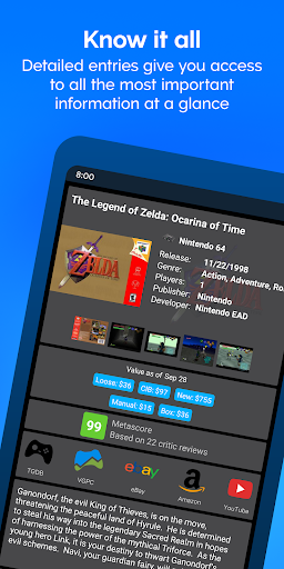 • Maklumat permainan: Imej perlindungan resolusi tinggi, screenshot, seni kipas, permainan Gambaran keseluruhan, butiran pelepasan, pautan ke Amazon, eBay, YouTube, Thegamesdb.net, Metacritic, dan Pricecharting.com