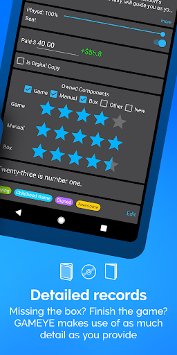 • Penyimpanan Rekod: Menjejaki apa bahagian permainan yang anda miliki (manual, permainan, kotak, yang lain, dimeteraikan) dan pelbagai keadaan mereka . Berapa banyak yang anda telah bayar untuk permainan (berbanding dengan berapa banyak ia bernilai!) Dan berapa banyak permainan yang anda telah dipukul! Simpan nota individu pada item.