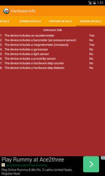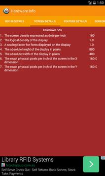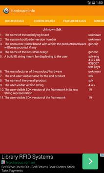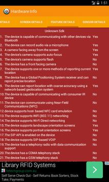 Hardware Info App lists the hardware specifications of your android device. It displays the "Build Details", "Screen Details", "Feature Details" and "Sensor Details" of your device.