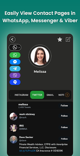 membolehkan anda dengan cepat melihat profil media sosial rakan-rakan anda dan WhatsApp yang terdahulu, Messenger, Viber, Telegram, atau mesej teks dengan anda.