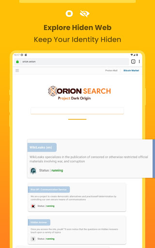 pelayar Orion tidak syak lagi seorang teman mudah alih yang berguna untuk melihat web gelap.Ini jauh dari pelayar standard yang kebanyakan orang biasanya mencari. Dengan bantuan rangkaian TOR, anda dengan yakin dapat meneliti setiap hasil carian tanpa membahayakan identiti dalam talian anda walaupun dari penyemak imbas itu sendiri.Unblock tapak terkurung dan cari secara terbuka tanpa batasan sama sekali.