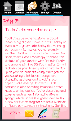 The Hormone Horoscope App "Classic" is an easy-to-use menstrual cycle tracker that gives you something no other app can: The daily Hormone Horoscope--a forecast that tells you what your mood, energy, love life, spending habits, sleep quality, health and much more will be based on the levels of your hormones for each day.