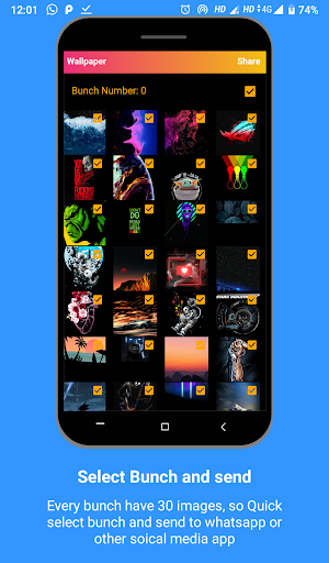 IFast picker app has automatically created bunches of 30 images each, so just select bunch and send to social media apps