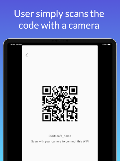 Jangan berkongsi kata laluan wifi anda. Hanya menjana kod QR. Pengguna boleh mengimbas kod dan secara automatik menyambungkan wifi. Penggunaan terbaik untuk tempat awam seperti kafe, restoran, dan sebagainya.