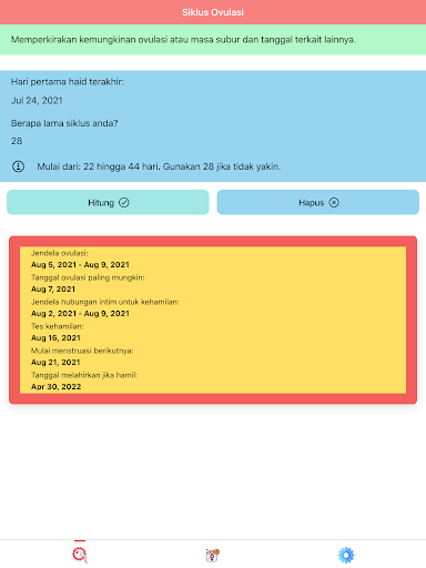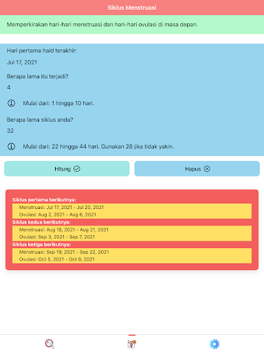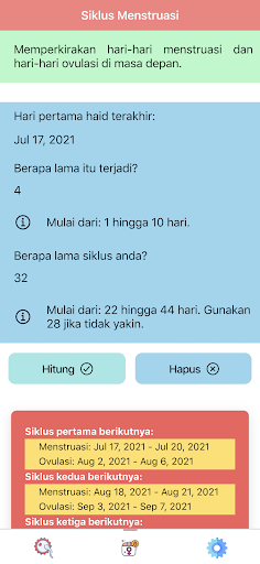 "Ovulasi dan kitaran haid: Kalendar kesuburan" juga mempunyai ciri kitaran haid. Ciri ini akan membolehkan anda menentukan haid seterusnya. Dalam ciri ini, "ovulasi dan kitaran haid: Kalendar kesuburan" juga akan menentukan hari-hari ovulasi yang paling mungkin, iaitu hari di mana seorang wanita yang paling mungkin ovulasi.