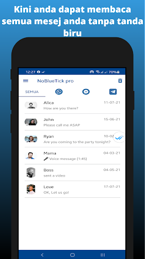 Apabila anda menerima mesej dari aplikasi sembang, itu juga akan dipaparkan di NoBlueTick. Di sana, anda boleh membacanya kapan pun anda mahu, tanpa ada rakan anda yang mengetahui bahawa anda pernah melihatnya.