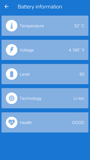 - Displays information about fast charging, battery details voltage and temperature.