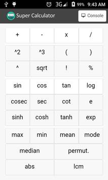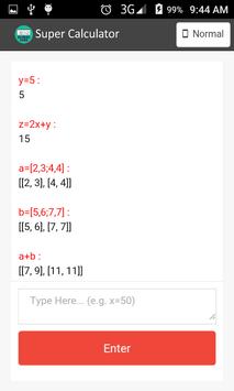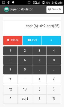 Super Calculator is a very powerful multifunction calculator, with good design and included scientific calculations. Just provide valid Equation with proper brackets, and this calculator can solve really long equations too. Super Calculator Comes with a Console mode where you can use variables and solve complex equations like matrices and much more. E.g. a = [1, 2, 3; 2, 5, 6] stores 2x3 Matrix in variable a and can be used for calculation, just double tap on the console button on top right corner. It is Powered By Math.js a powerful maths library.