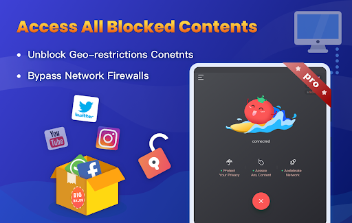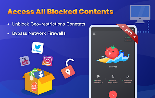 You can unblock any sites, app or games with VPN Tomato Pro. Bypass government censorship and geo-restrictions to access social networks such as Facebook, Twitter, YouTube, Snapchat, PUBG, Free Fire, Twitch, etc., or any other blocked websites from anywhere! Watch TV, movies and live sports from any country no matter where you are.