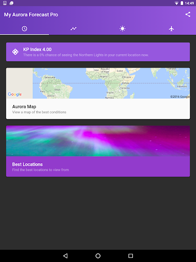 Pro Forecast Aurora saya adalah aplikasi terbaik untuk melihat lampu utara. Dibina dengan reka bentuk gelap yang anggun, ia merayu kepada kedua-dua pelancong dan pengamat Aurora yang serius dengan memberitahu anda apa yang anda ingin tahu - sama ada itu adalah seberapa mungkin anda melihat aurora borealis atau butiran mengenai angin suria dan imejan matahari yang tinggi . Dengan aplikasi ini, anda akan melihat lampu utara dalam masa yang singkat.