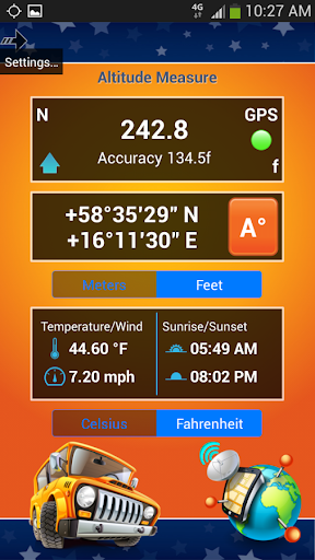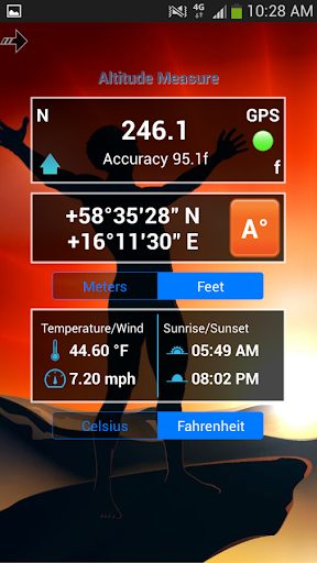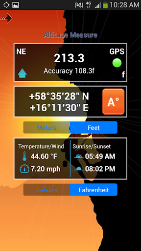 This app will help you to determine the altitude of your current position above see level. It can be useful for people involved in climbing and mountaineering, airplane pilots, travelers and everyone who wants to know his/her elevation.