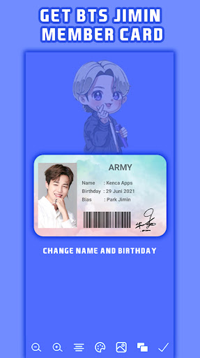 Anda juga akan mendapat kad ahli terus dari BTS Jimin.Anda akan menjadi ahli rasmi tentera BTS Jimin.Jika anda seorang peminat BTS Jimin, muat turun dan dapatkan kad ahli BTS Jimin !!!
